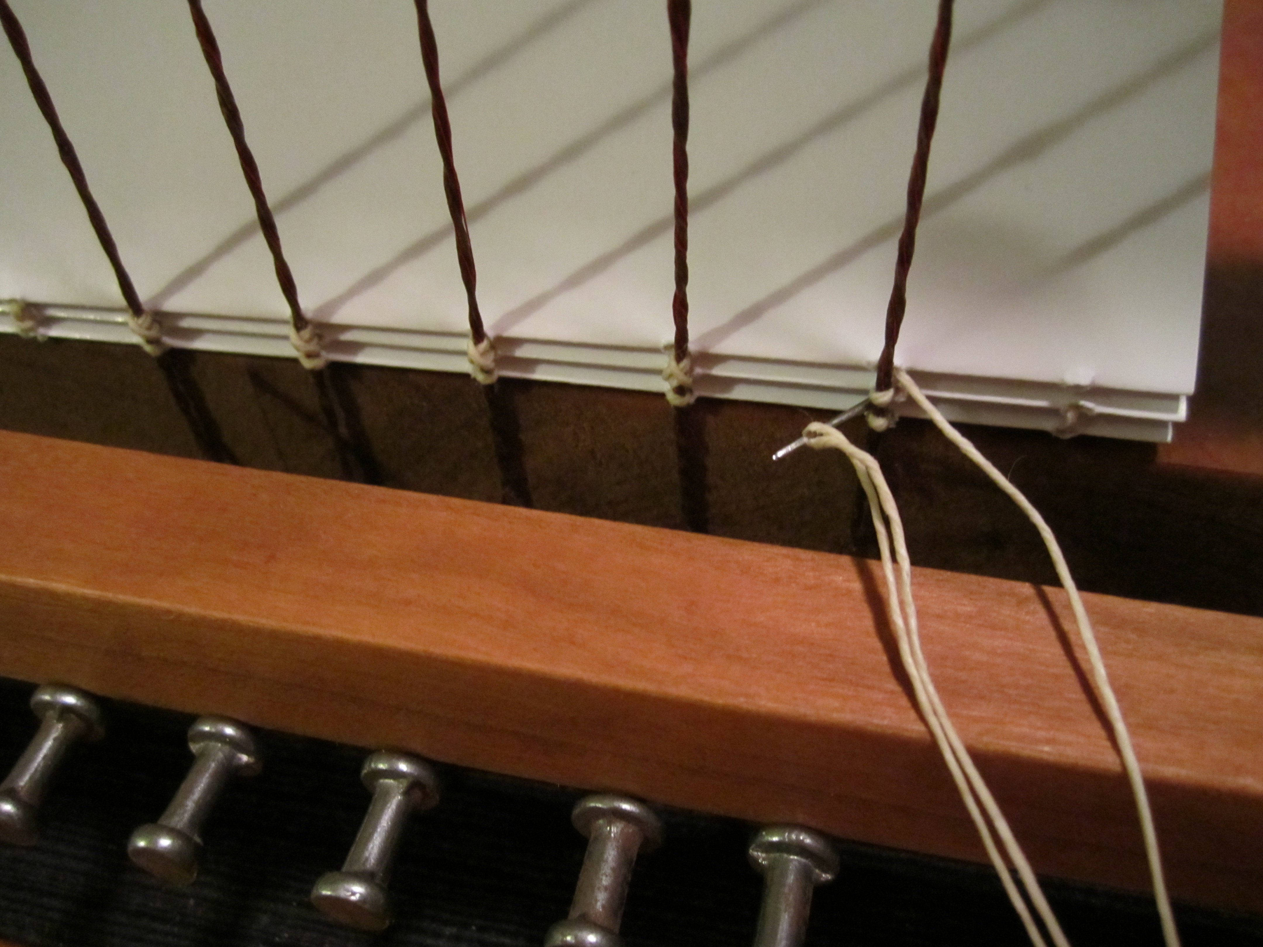 Lolks like unfinished. Those knots will bother all the time you take it or put in bag/pocket/whatever. Keep in mind design should not create bothering user experience making thing useless. Anyway thank you for idea with crossed overlapping the supporting threads.