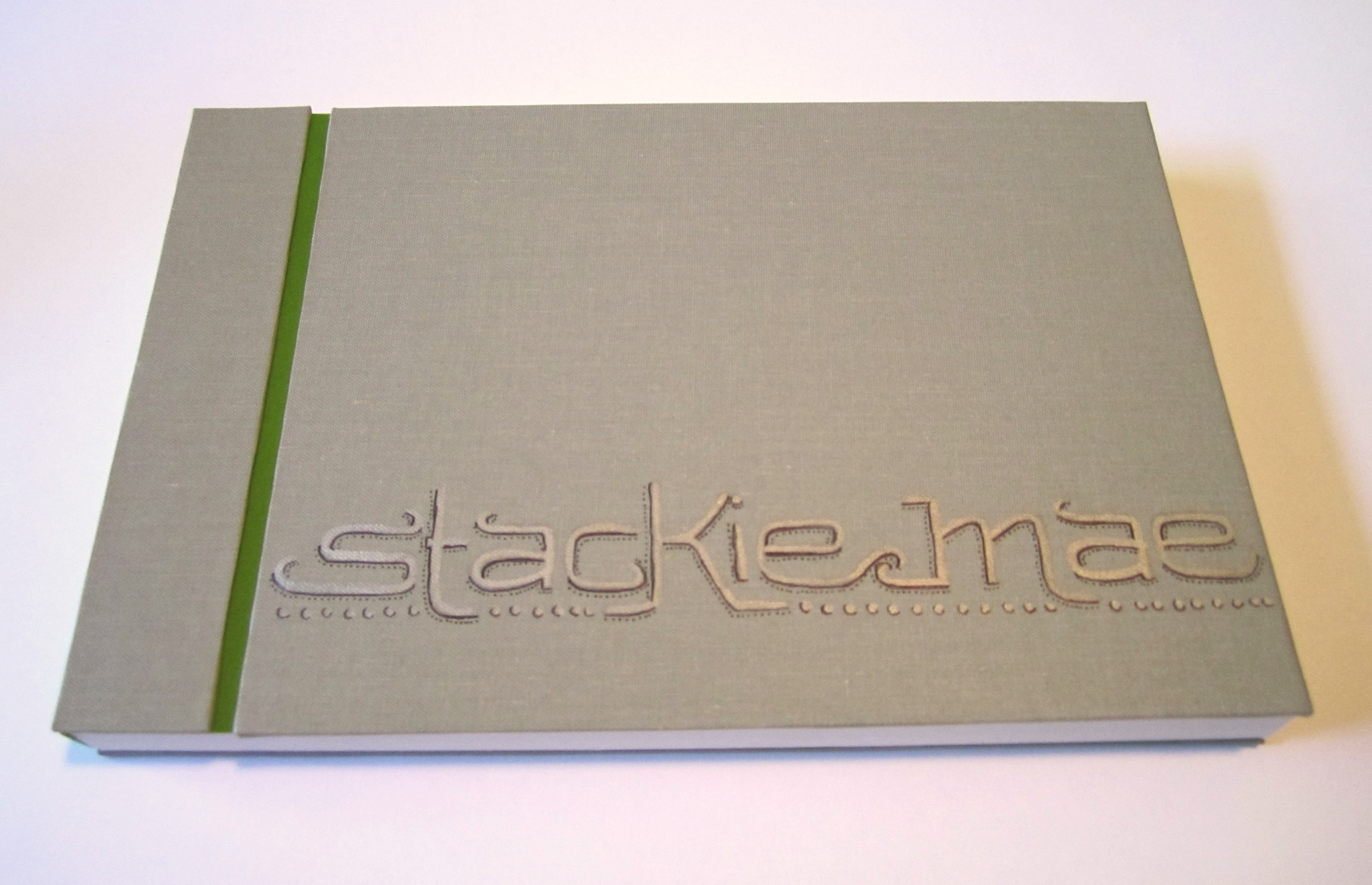 This style was called ‘Japanese ledger binding’ by the professor who taught me…only I’ve not had success in finding many other examples online. It’s pretty simple, which is why I added Stacy’s nickname to the top.