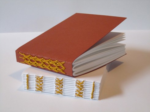 The top book, with the orange cover, isn’t a French link stitch…it’s the three-section sewing. And yes, the pattern is from Keith’s book. I learned the French link technique from a professor, and can’t recall if i’ve seen it anywhere else…