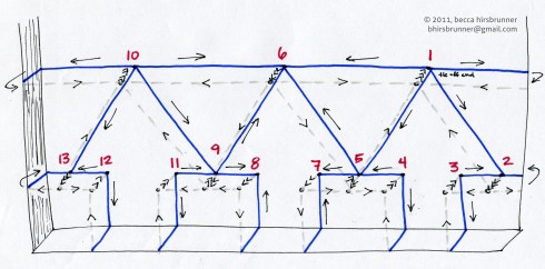 I only had room for 3 ‘arrows’ on my paper…but you can expand the pattern and repeat the first two arrows until you have enough to fill your spine. Don’t forget to wrap the edges! Also, you should never have doubled thread on either the top or bottom covers. If you do discover that instead of one unbroken ‘—-‘ line you have a doubled “====” line, pull it out. It might not seem like a big deal, but it will be a problem later on.