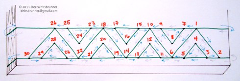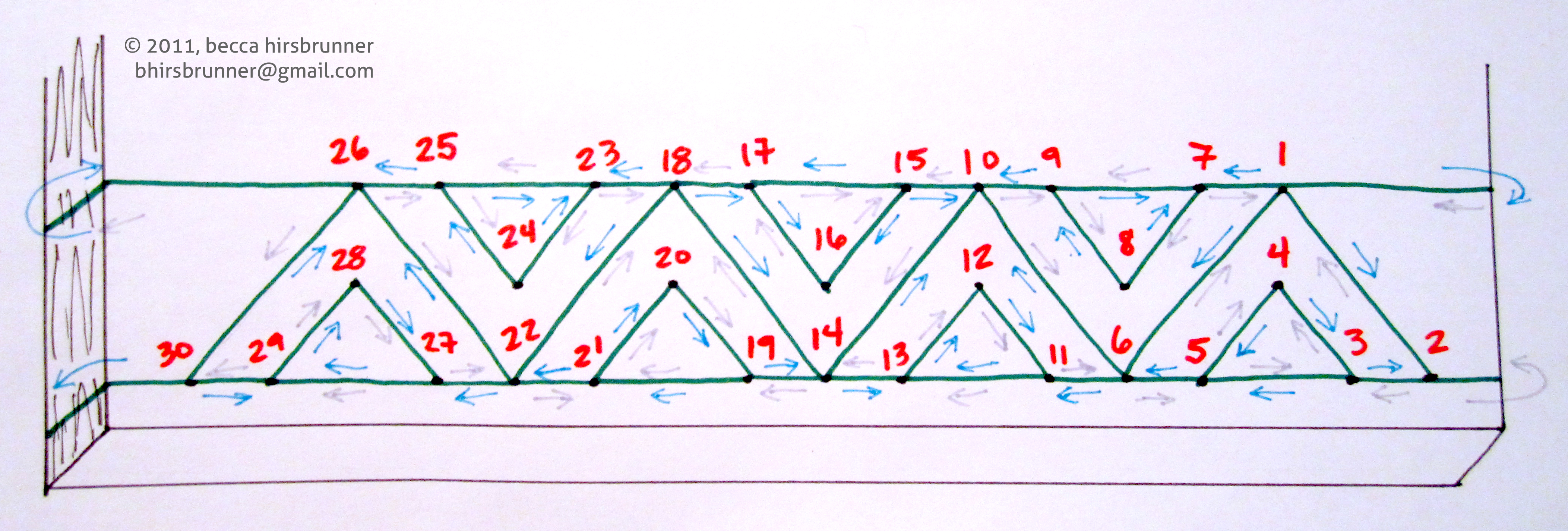 I’m still playing around with how to best portray the top and the underside of each binding pattern. The gray arrows indicate the direction on the underside of the book block.