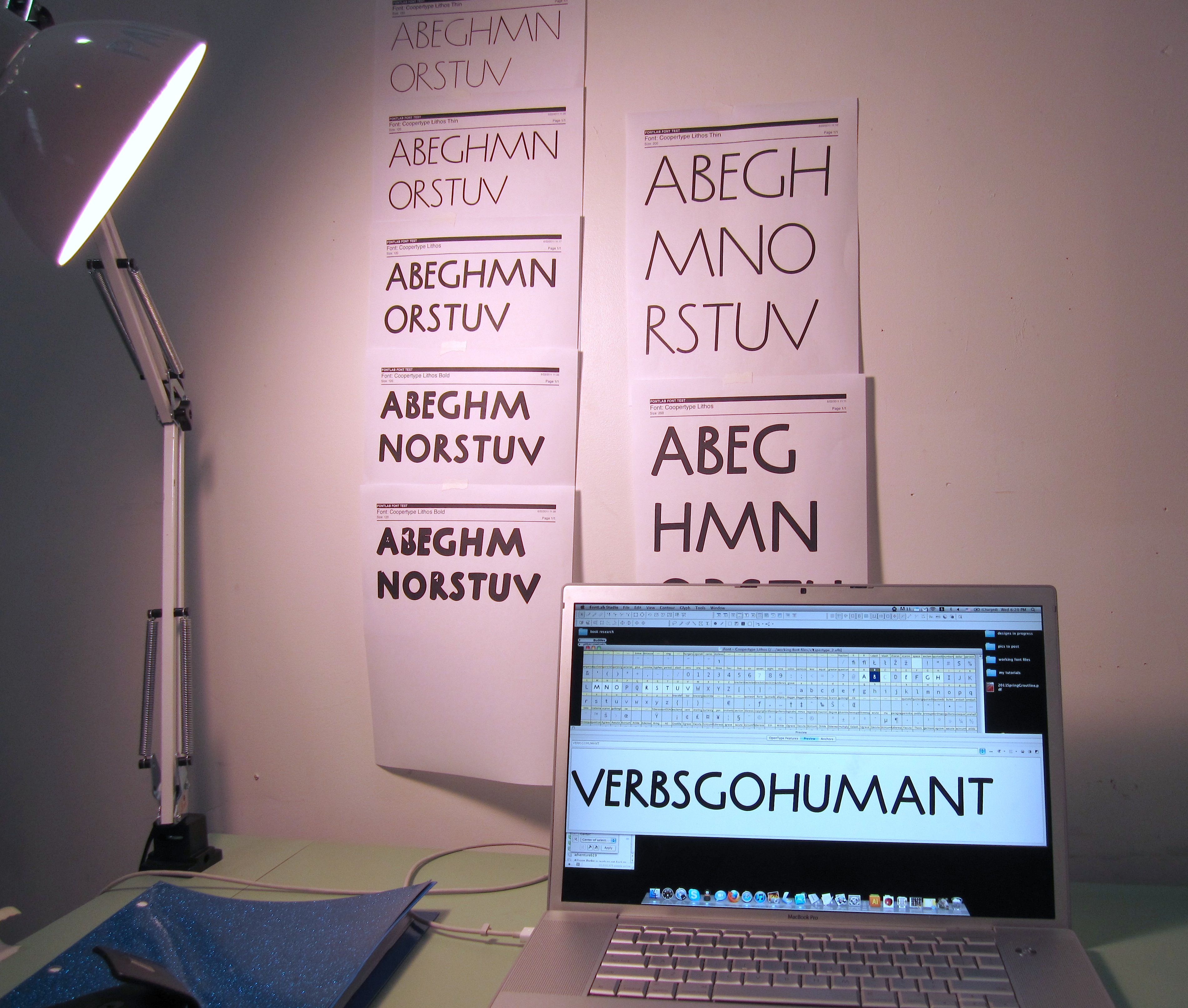 First today we worked on making/faking different weights of the letters we drew yesterday. They aren’t proper weight changes, which is why you can see the counters of the bolder fonts have issues. But the goal from there was to take the mid weight and start modifying it in a direction of my choosing. The letters in the bottom image are my attempt to do that. Sumner hasn’t seen them yet so I’m not sure what he will say…but I kinda like the way they are going, so far.