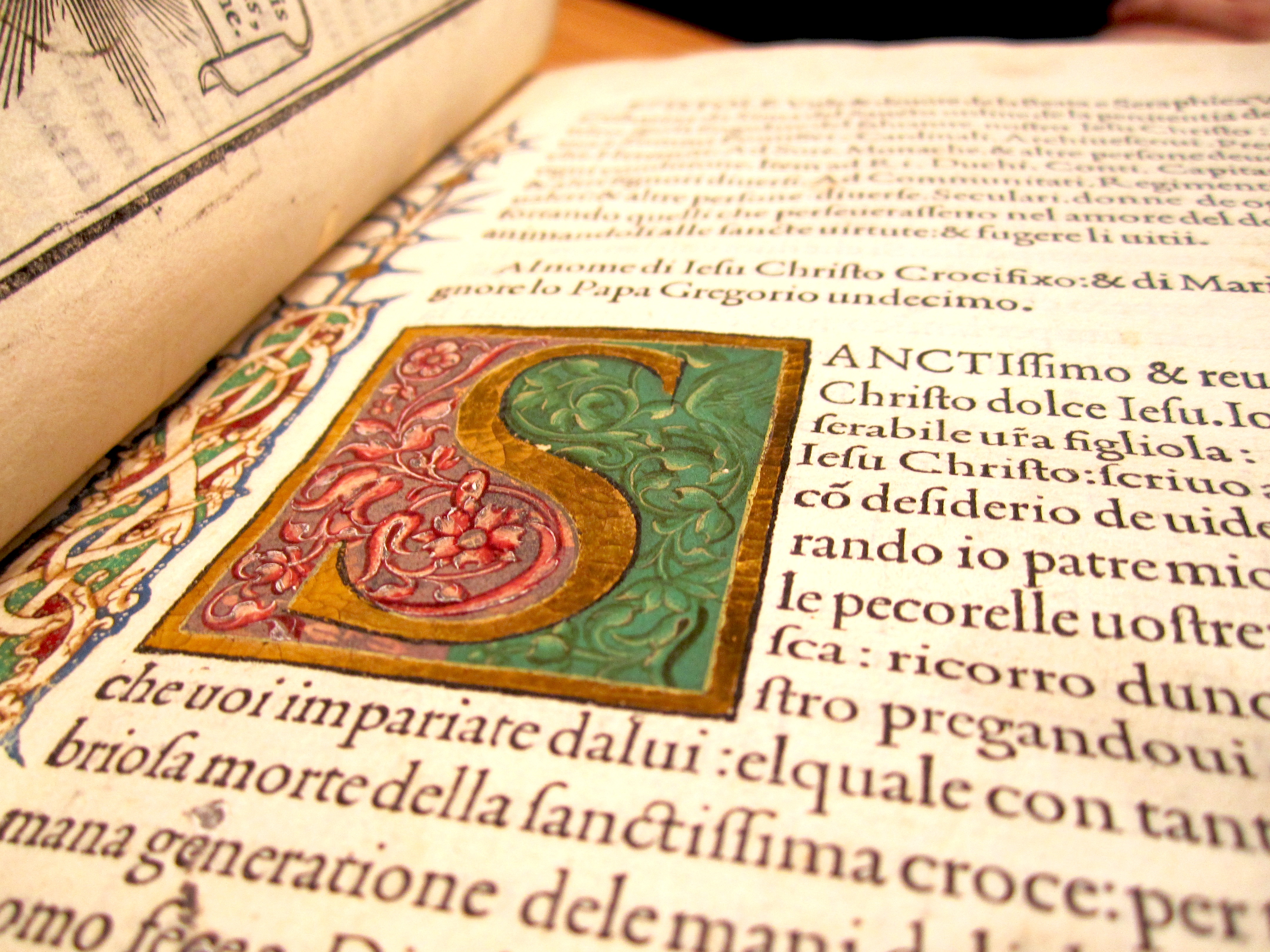 From the Butler Library. This book, the Epistole Devotissime de Siena, (1500AD) has the first ever printed italic text. This is the fronticepiece, or first (and highly decorated) page.