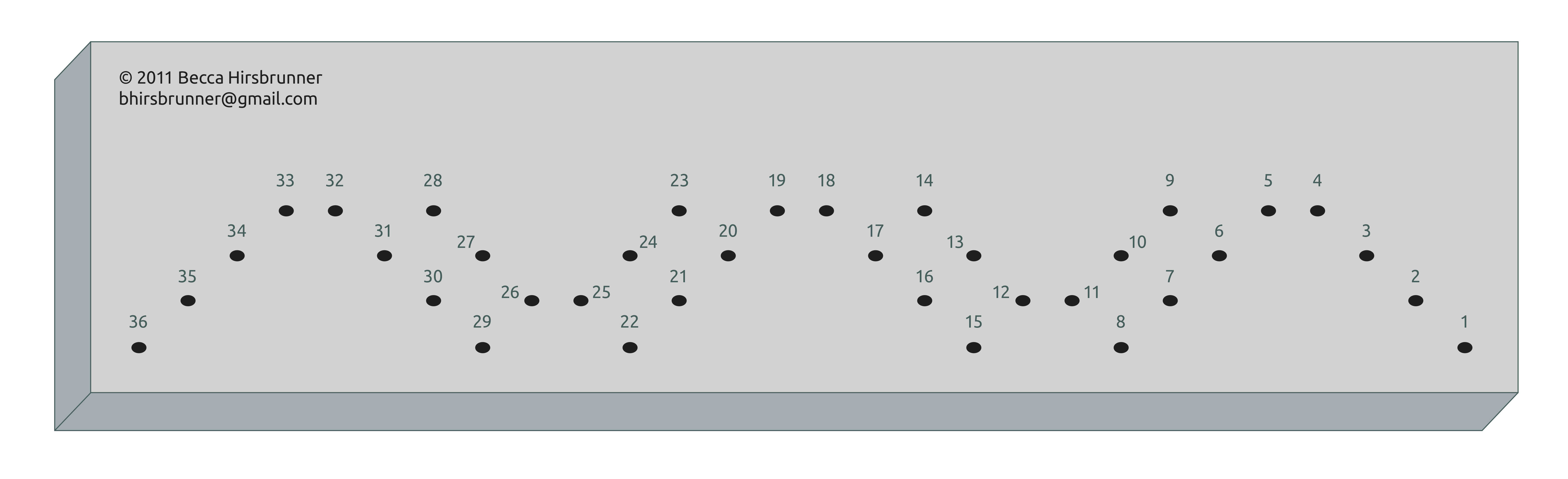 This was a complicated tutorial to write (and I’ve been ill, so if there are any errors, please let me know), but I think that it’s about an intermediate level bind. The holes should be placed along four horizontal lines. When making the spine loops from stations 4, 18, and 32, DO NOT pull it too tight! You will have a hard time sewing the following loops if you do.