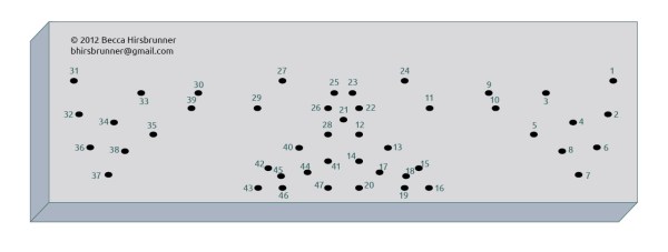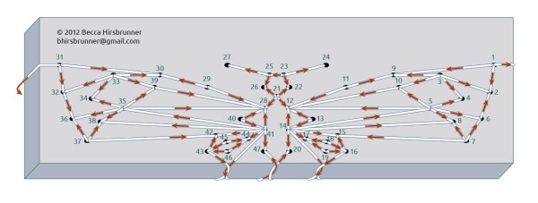 exit 47, wrap around spine, thread needle through loop from 20, point needle right, exit 47 again