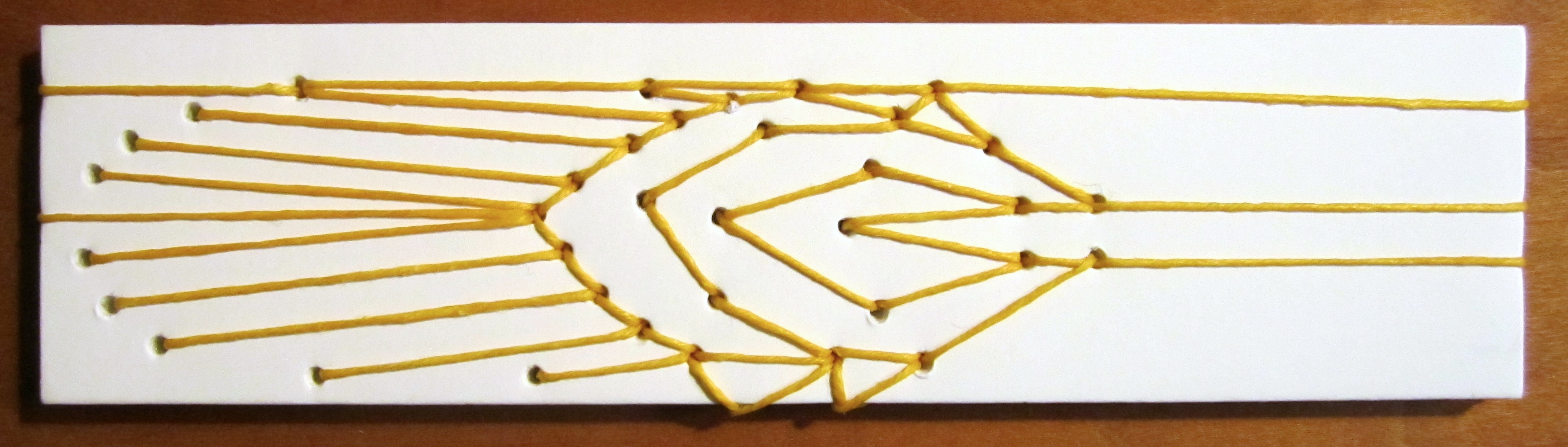 Early in my experimenting I decided that straight perpendicular lines by themselves were boring. I figured out that the spine could be wrapped with a ‘V’ shape by crossing one loop with another previous loop (or loops). So far the only shape that seems impossible is a circle, but I’m working on it!