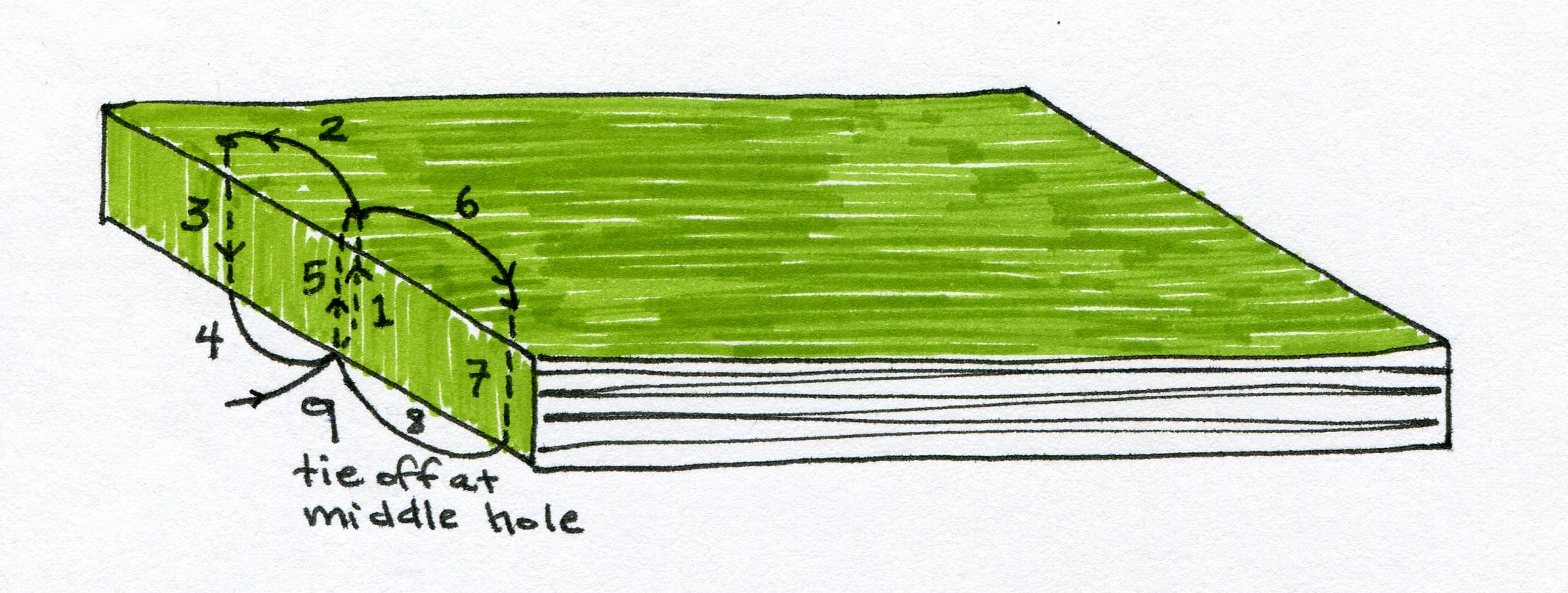 Not that it’s much of a tutorial. I drew these instructions a couple of years ago, fully intending to post them…and then forgot. Or was distracted by other things. Not very hard to believe, if you know me! I was asked for more information about a ledger bind I previously posted, so here is what I know.