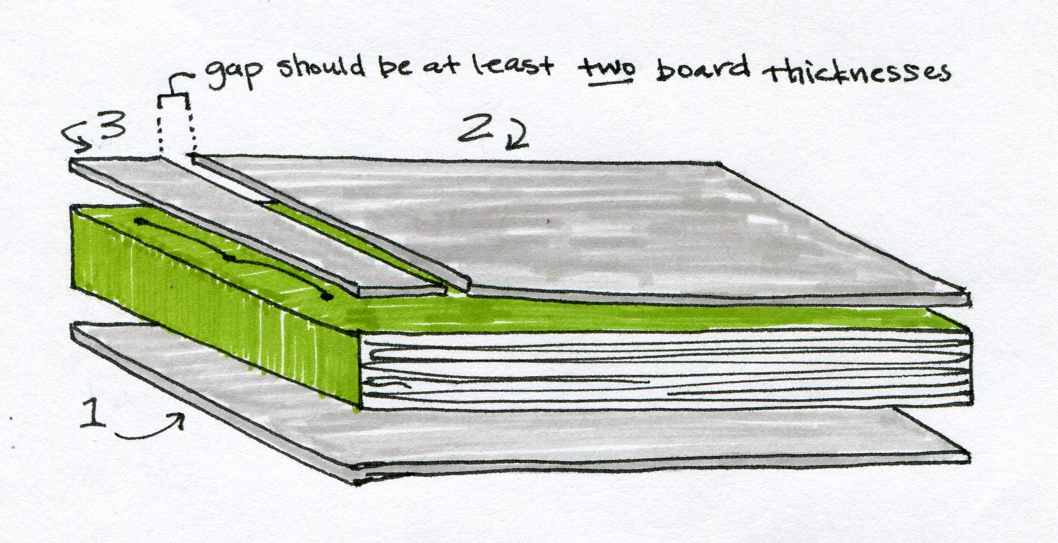 The boards for the front cover should leave a gap that is twice the thickness of the board. If you skimp on the gap, your book will not open all the way. Don’t go overboard with the gap though, because the section of the cover with board #2 will flop too much and be more likely to eventually rip off. Board #3 should be wide enough to cover the stitching.