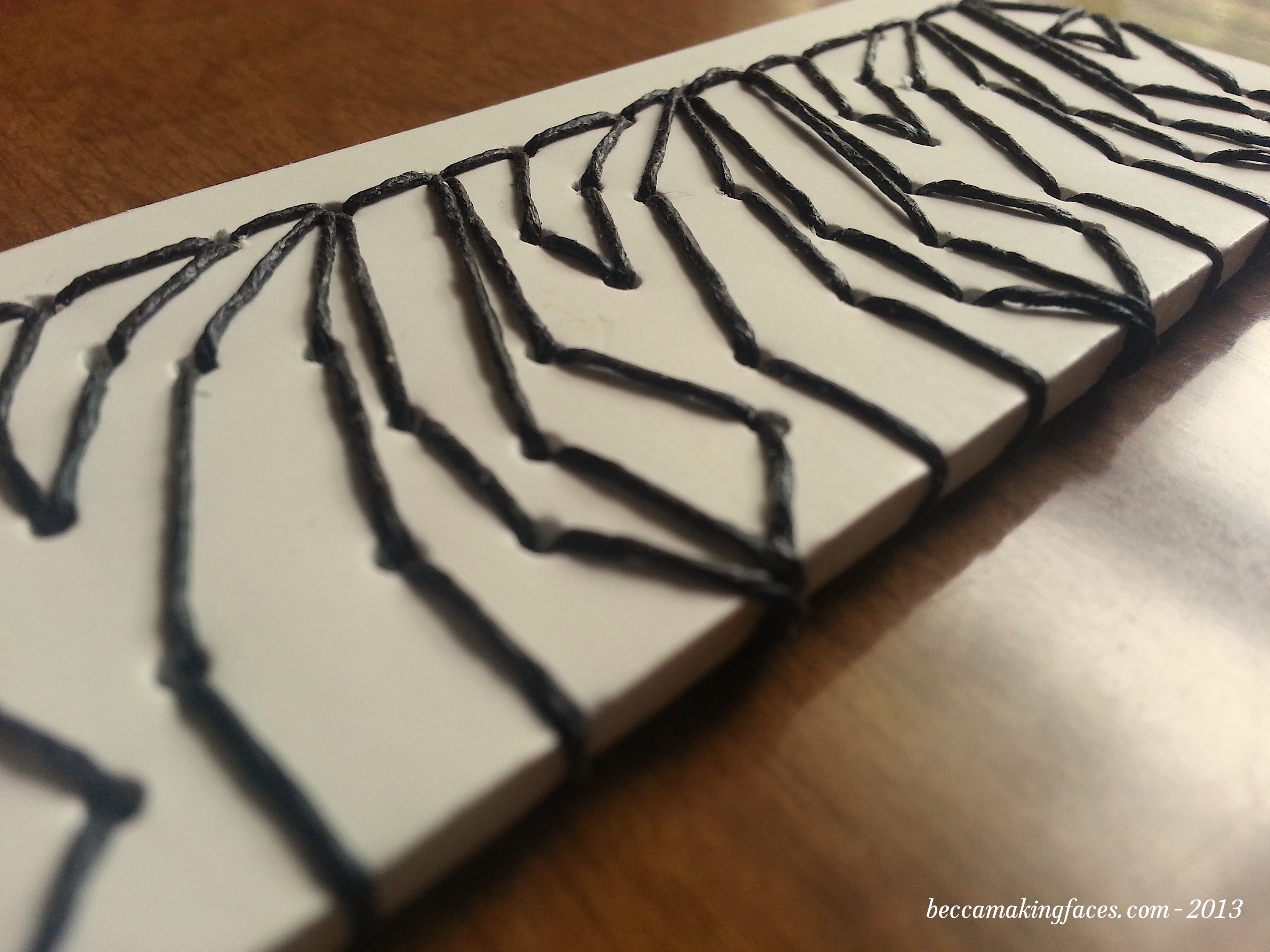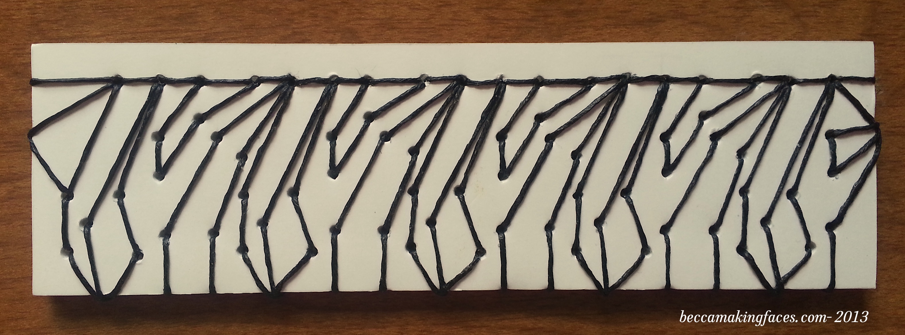 An accidental animal print. 74 holes on this one. I suppose that a real animal print wouldn’t have repeats, but…oh well. The sides on this design are a bit tricky, as are the Vs on the spine. I wrapped the spine 8 times to get the thread length. 6″(15.24cm) wide, .25″(.64cm) thick.