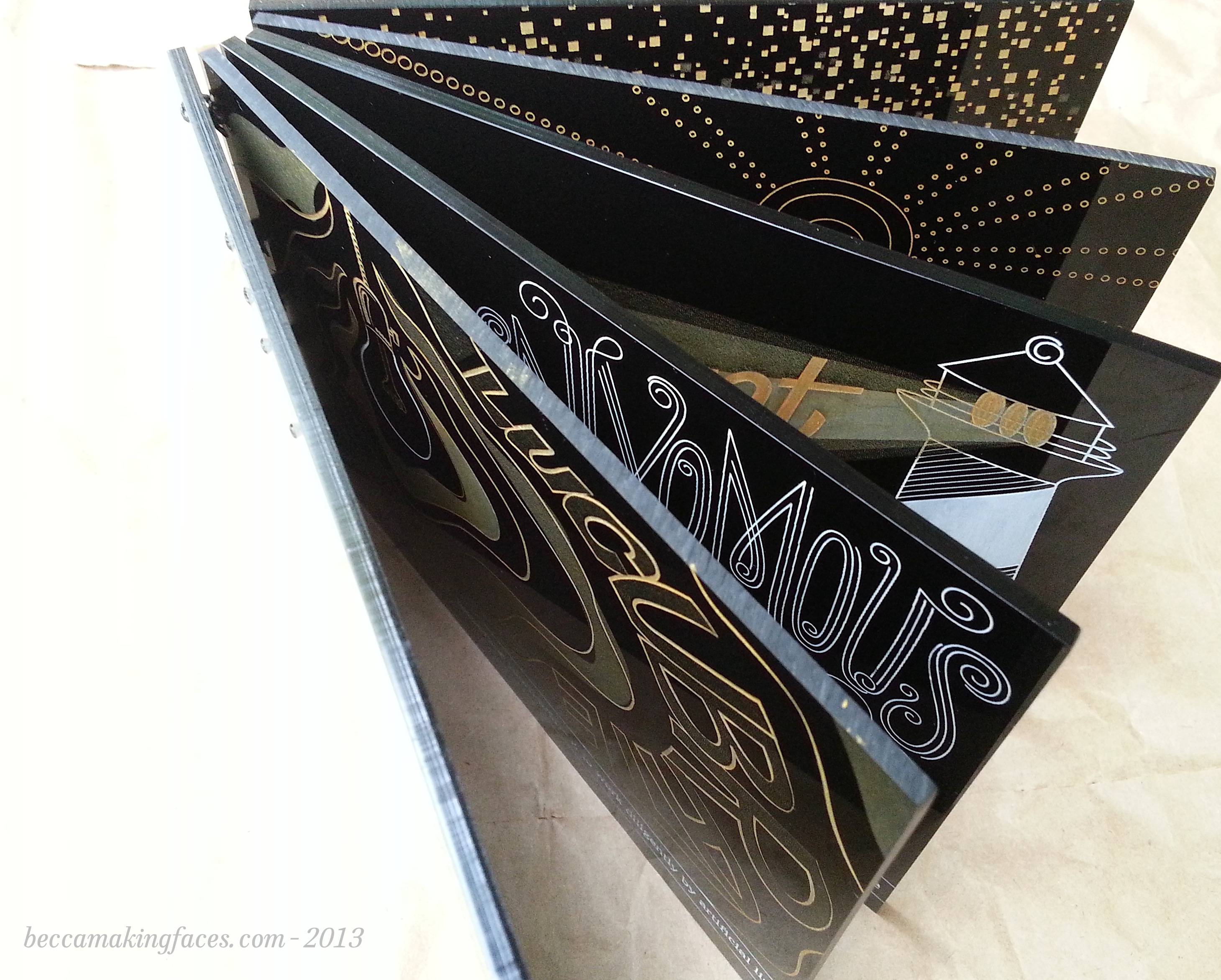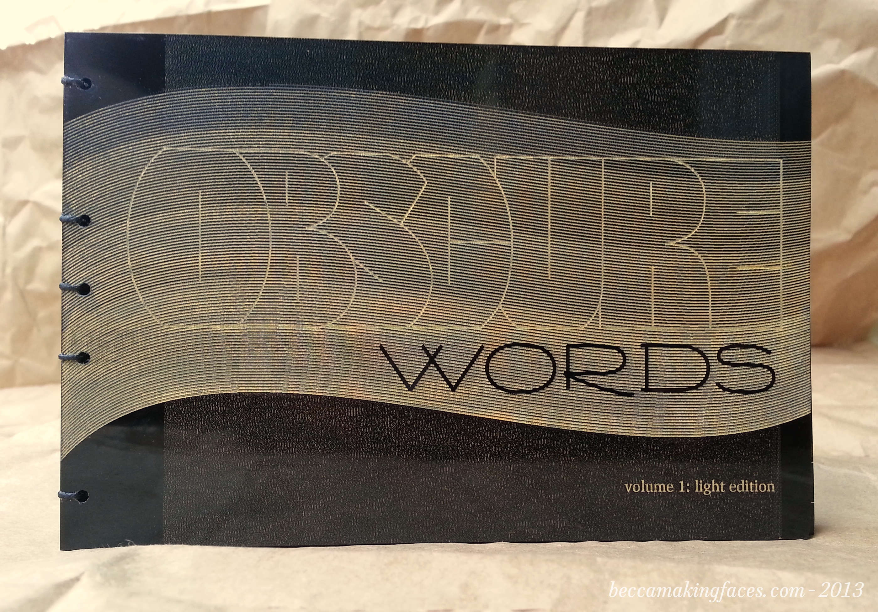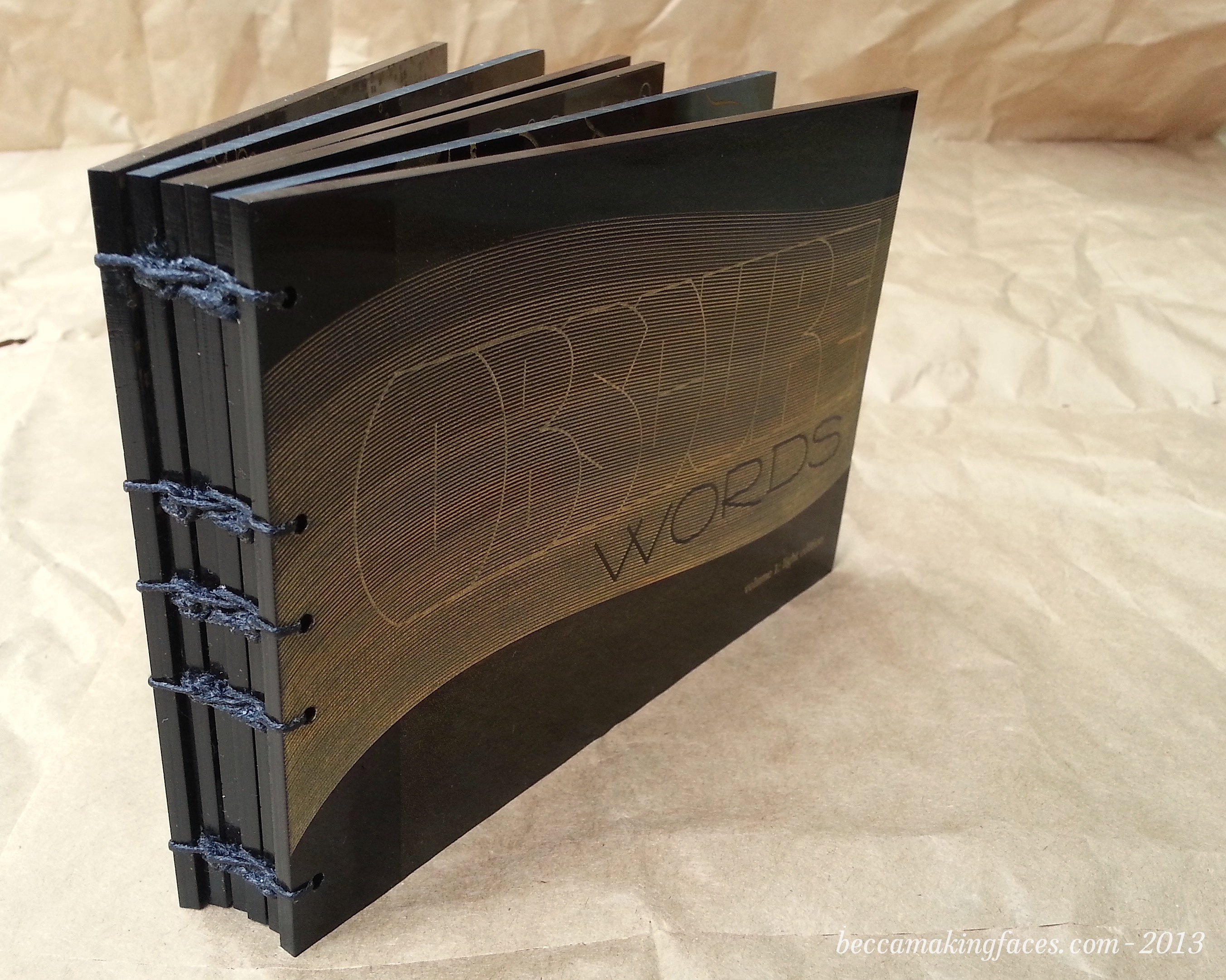 For a while now I’ve been wanting to create a project using obscure or old-fashioned English words. I just wasn’t sure how I would do it. Enter the fabrication lab and the laser cutter! I decided to create a ‘book’ of laser cut and etched acrylic plastic sheets, sewn together with one of Keith A Smith’s techniques. Though the bind looks ok, I think I might have to redo it with a modified version. There just aren’t enough pages for the design to look right.