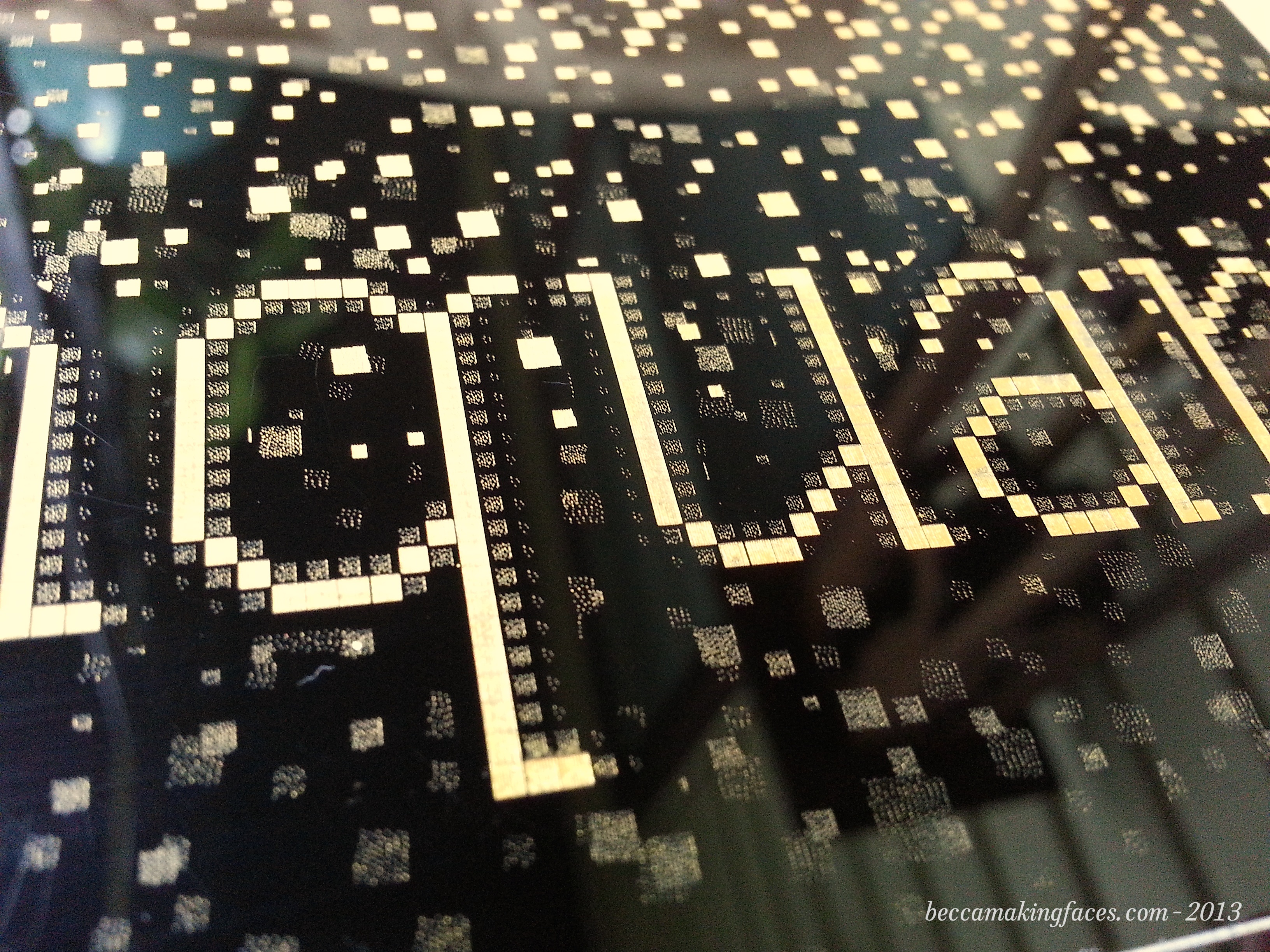 I tried a couple of different colors of acrylic paint, but settled on white and a shimmery gold. I smeared the paint into the etched lines and gradients, then wiped (or scrubbed, if it had dried) off the excess paint.