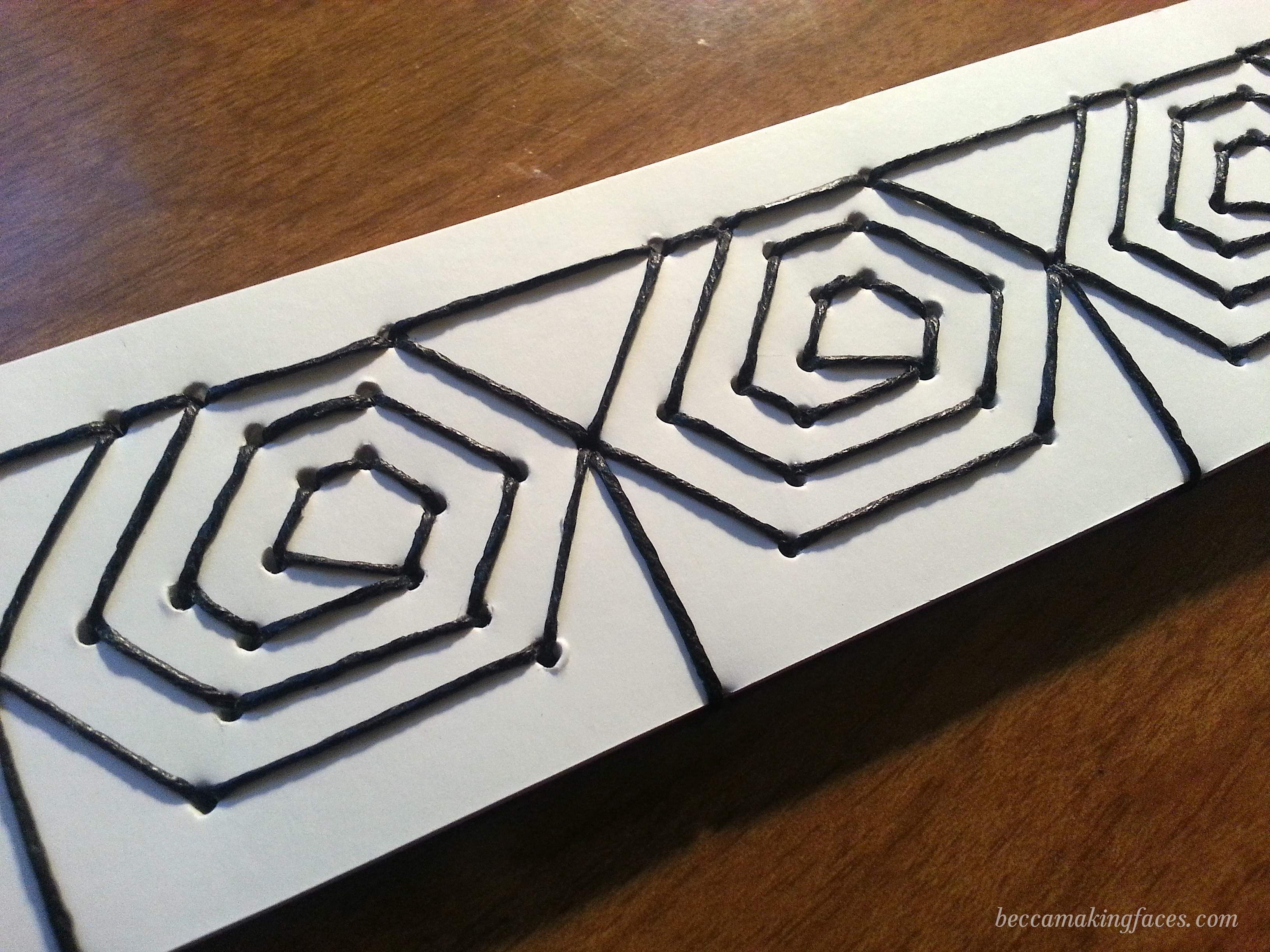 58 holes, 6″(15.24cm) wide, .25″(.64cm) thick. I wrapped the spine about 9 times to get thread length.