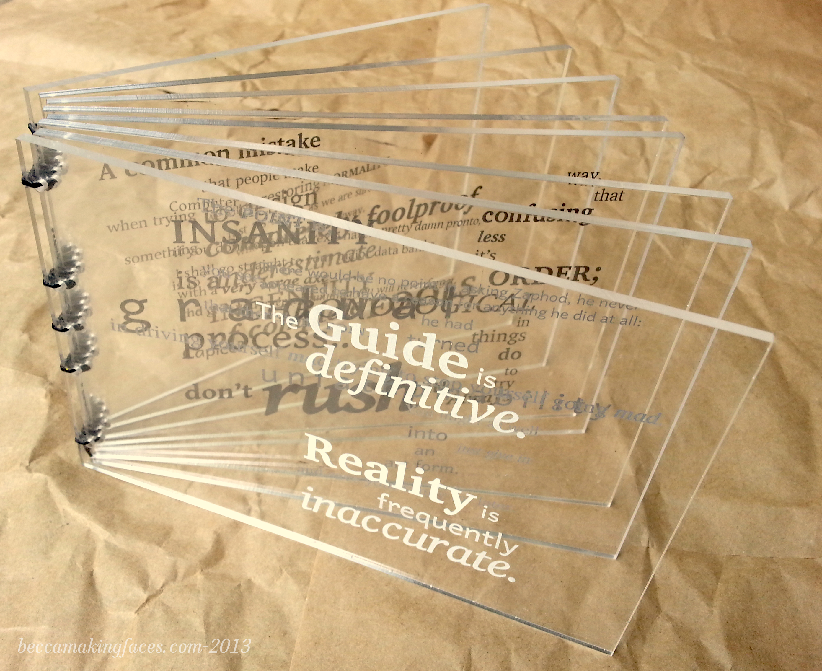 This was a birthday gift for a huge fan of the radio show/book/movie Hitchhiker’s Guide to the Galaxy. There is one quote per each of the eight pages, arranged so that when the book is closed the words form a ‘word cloud’. The pages are laser-cut and etched acrylic plastic and are sewn with waxed linen thread using the same method as in my previously posted book. I wanted to create a gradient of sorts using paint in the etched letters, fading from white to black. It mostly worked the way I wanted it to.