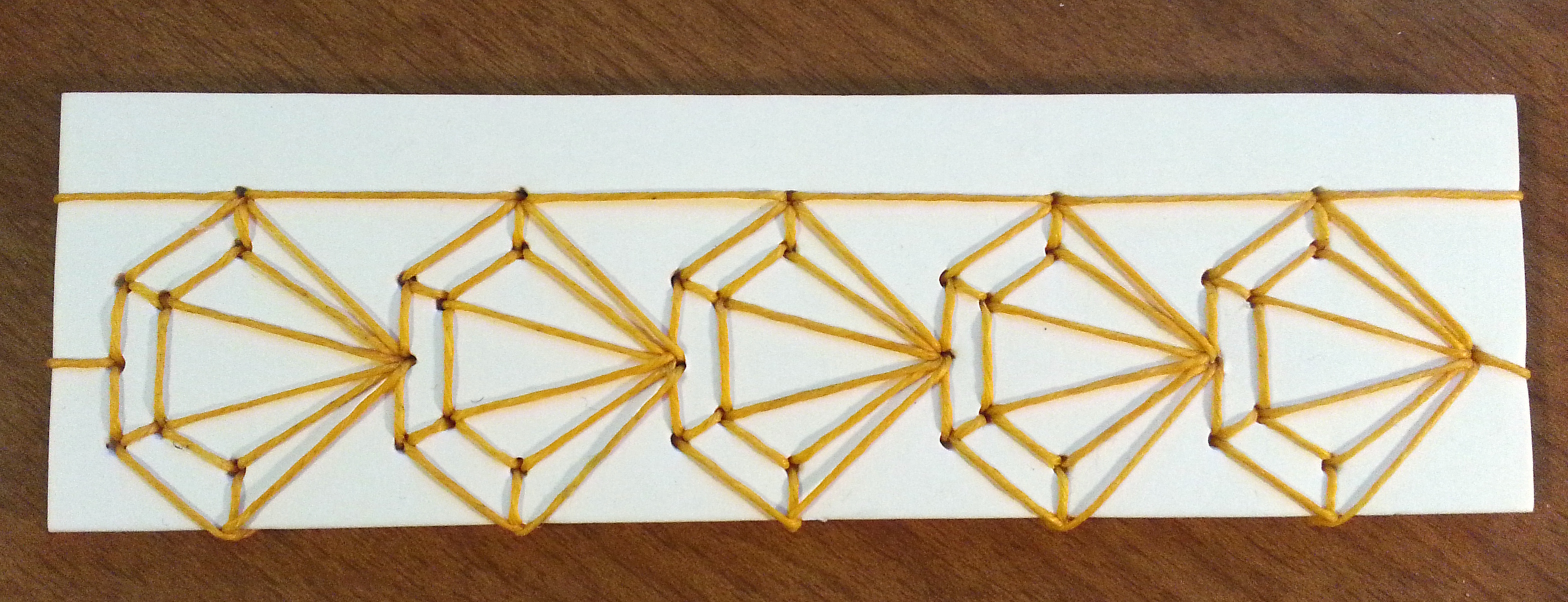“Diamond gems”, with five repeats instead of four because I’m a rebel. 46 holes. Could be fun with sparkly thread on a dark background! Intermediate, I’d say.