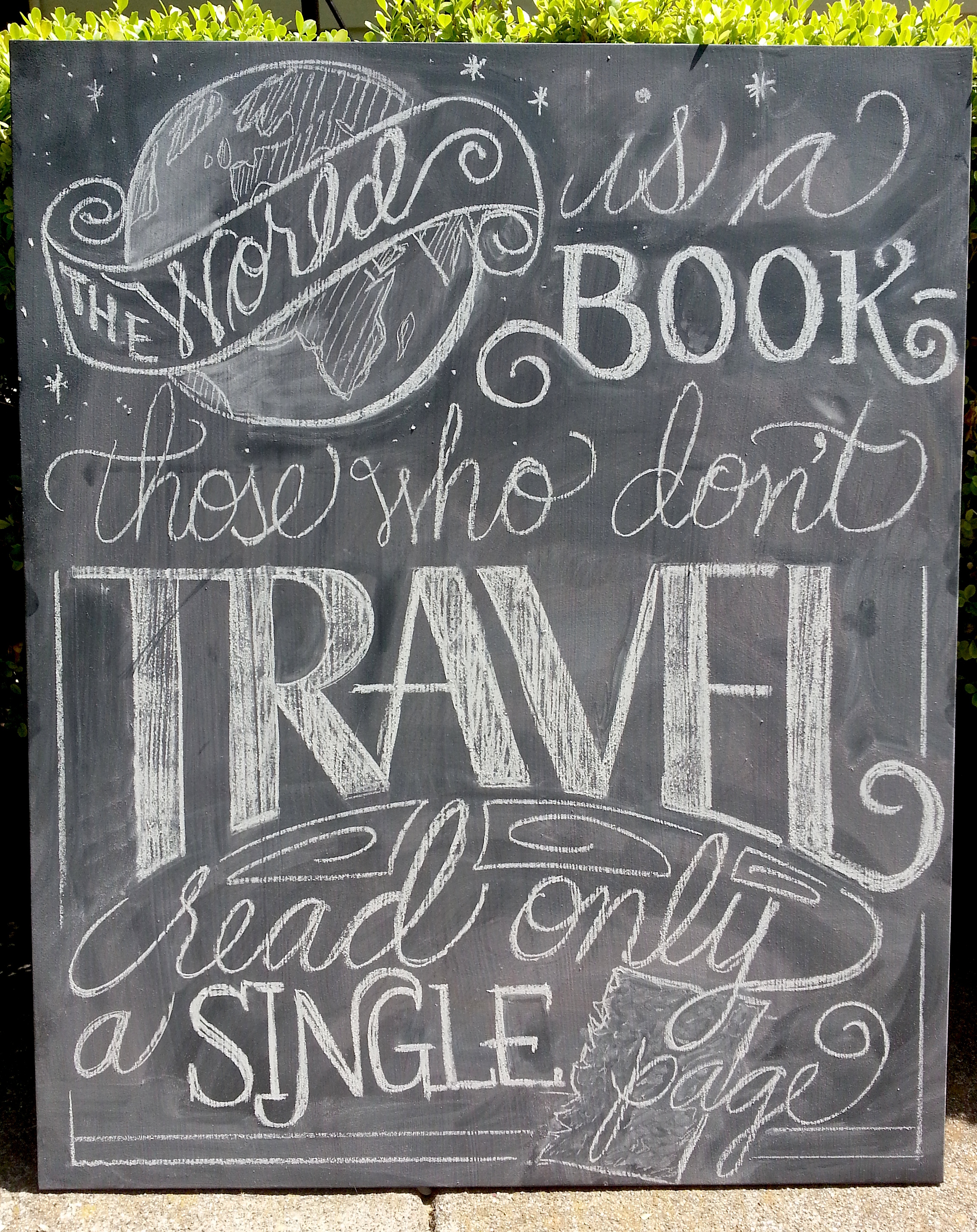 Lately I’ve been inspired by all of the chalk art I’ve seen on the interwebs, enough to buy some chalkboard paint and chalk and make my own boards to experiment on. I’m not up to the level of Dangerdust yet, but you know what they say about practice… In any case, there is something very alluring about the ephemeral nature of chalk art, and I’ve been having fun chalking away. Now if I could just figure out what to do about the piles of dust left behind…